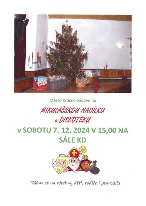 Město Krásno vás zve v sobotu 7. 12. 2024 od 15:00 hodin na MIKULÁŠSKOU NADÍLKU s DISKOTÉKOU do Kulturního domu v Krásně. Těšíme se na všechny děti, rodiče i prarodiče.