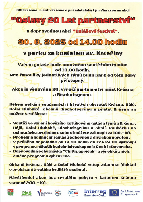 SDH Krásno, město Krásno a pořadatelský tým Vás zvou na akci "Oslavy 20 let partnerství" a doprovodnou akci "Gulášový festival" 30.8.2025 od 14hodin v parku za kostelem sv. Kateřiny.