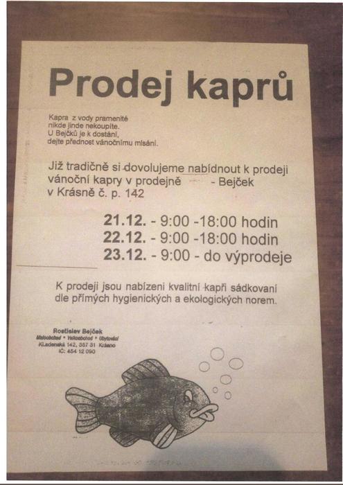 Již tradičně v prodejně Bejček, Krásno čp. 142 se uskuteční prodej sádkových kaprů: 21.12. ...9:00-18:00 hodin, 22.12.....9:00-18:00 hodin, 23.12.....9:00-do výprodeje.