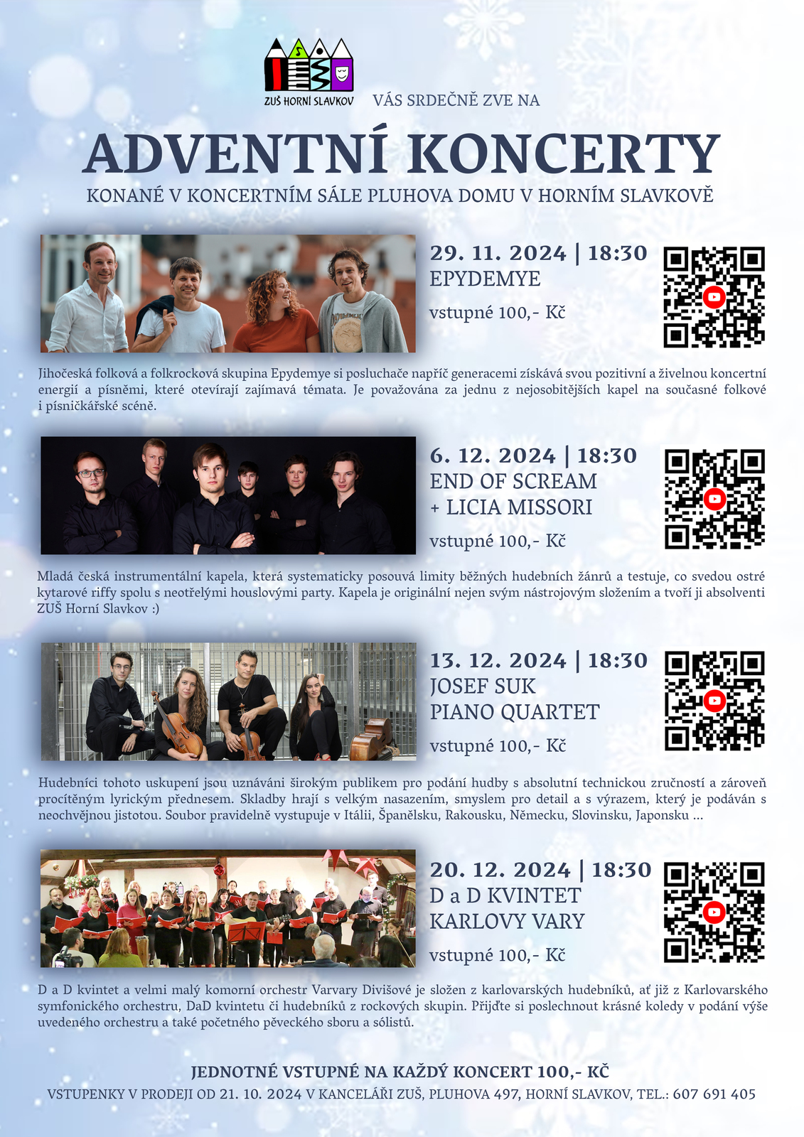 ZUŠ Horní Slavkov Vás zve na ADVENTNÍ KONCERTY konané v koncertním sále Pluhova domu v Horním Slavkově ......více ZDE