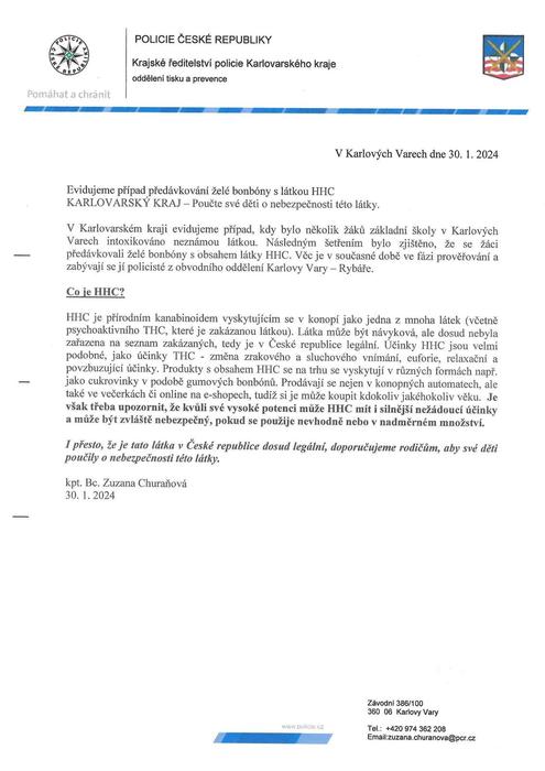 V Karlovarském kraji evidujeme případ, kdy bylo několik žáků základní školy v Karlových Varech intoxikováno neznámou látkou. Následným šetřením bylo zjištěno, že se žáci předávkovali želé bonbóny s obsahem látky HHC. Věc je v současné době ve fázi prověřování a zabývají se jí policisté z obvodního oddělení Karlovy Vary – Rybáře.