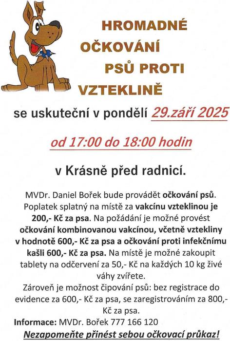 MVDr. Daniel Bořek bude provádět očkování psů a koček. Poplatek bude splatný na místě za vakcínu vzteklinou je 200,- Kč za psa. Na požádání je možné provést očkování kombinovanou vakcínou, včetně vztekliny v hodnotě 600,- Kč za psa a očkování proti infekčnímu kašli 600,- Kč za psa. Na místě si můžete zakoupit tablety na odčervení za 50,- Kč na každých 10 kg živé váhy zvířete.