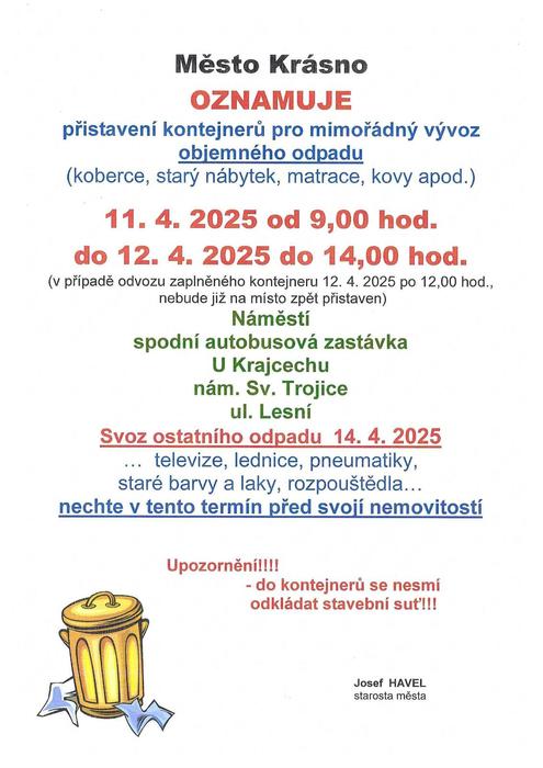 Město Krásno OZNAMUJE přistavení kontejnerů pro mimořádný vývoz objemného odpadu v Krásně (koberce, starý nábytek, matrace, kovy apod.) a to