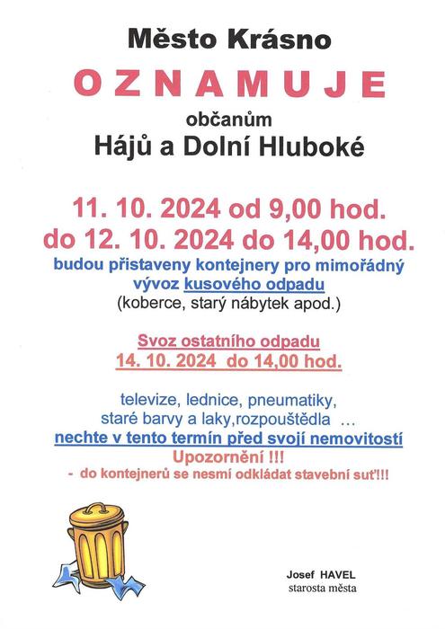 Město Krásno O Z N A M U J E občanům Hájů a Dolní Hluboké, že budou přistaveny kontejnery pro mimořádný vývoz kusového odpadu (koberce, starý nábytek apod.) a to v tomto termínu: