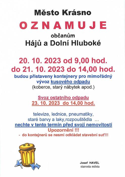 Město Krásno oznamuje, že ve dnech 20. - 21.10.2023 budou po Hájích a Dolní Hluboké přistaveny kontejnery na mimořádný vývoz objemného odpadu a 23.10.2023 se bude konat svoz nebezpečného odpadu....více ZDE