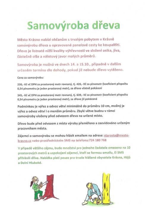 Město Krásno nabízí občanům s trvalým pobytem v Krásně samovýrobu dřeva u opravované panelové cesty ke koupališti. Dřevo je listnaté nižší kvality výhřevnosti ve složení osika, jíva, částečně olše a náletový javor malých průměrů. Samovýroba je možná ve dnech 14 a 15.10., případně v dalším určeném termínu dle dohody, pokud již nebude dřevo vytěženo.