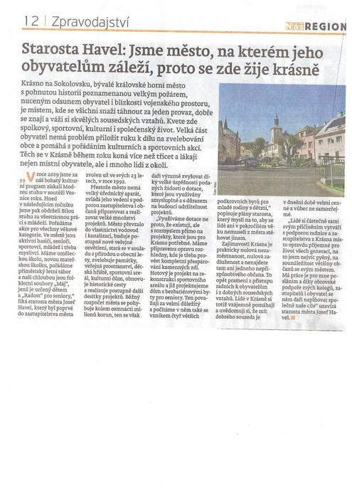 "Takto se o Krásnu píše" - v Krásně se krásně žije...4. dubna 2024 vyšel ve Zpravodaji NÁŠ REGION Plzeňsko-Karlovarsko článek - Starosta Havel:Jsme město, na kterém jeho obyvatelům záleží, proto se zde žije krásně........celý článek ZDE