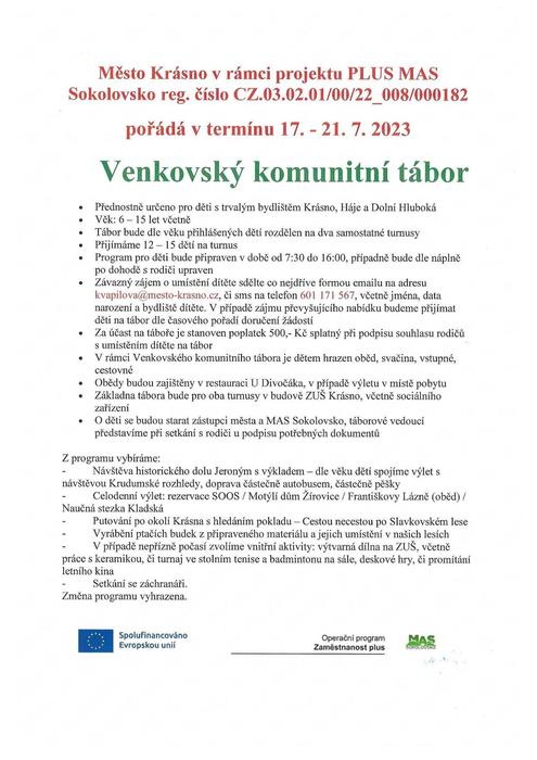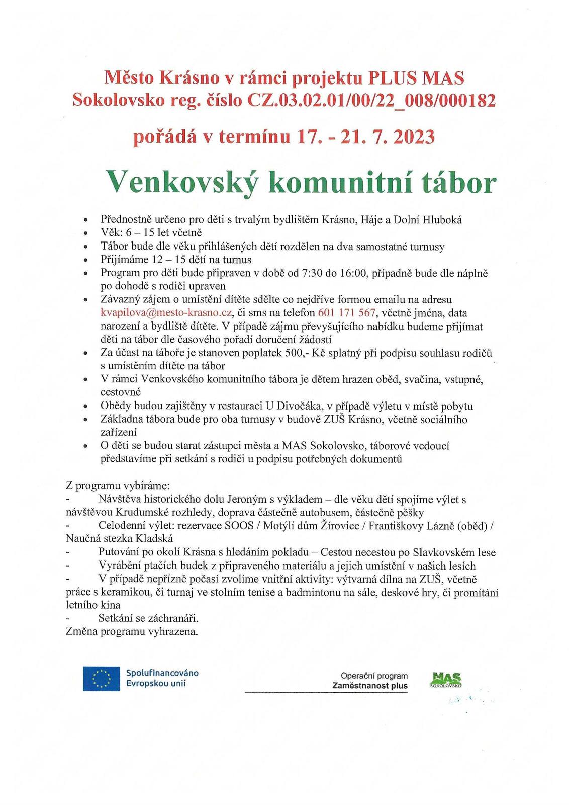- Závazný zájem o umístění dítěte sdělte co nejdříve formou emailu na adresu kvapilova@mesto-krasno.cz, či sms na telefon 601 171 567, včetně jména, data narození a bydliště dítěte. V případě zájmu převyšujícího nabídku budeme přijímat děti na tábor dle časového pořadí doručení žádostí