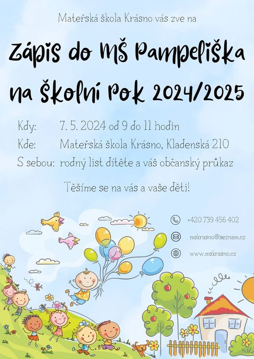 V Mateřské školce Pampeliška Krásno se bude dne 7.5.2024 od 9:00 do 11:00 hodin konat zápis pro školní rok 2024/2025. Rodný list dítěte a občanský průkaz rodiče sebou. Mateřská škola se těší na Vás i Vaše děti.....více ZDE